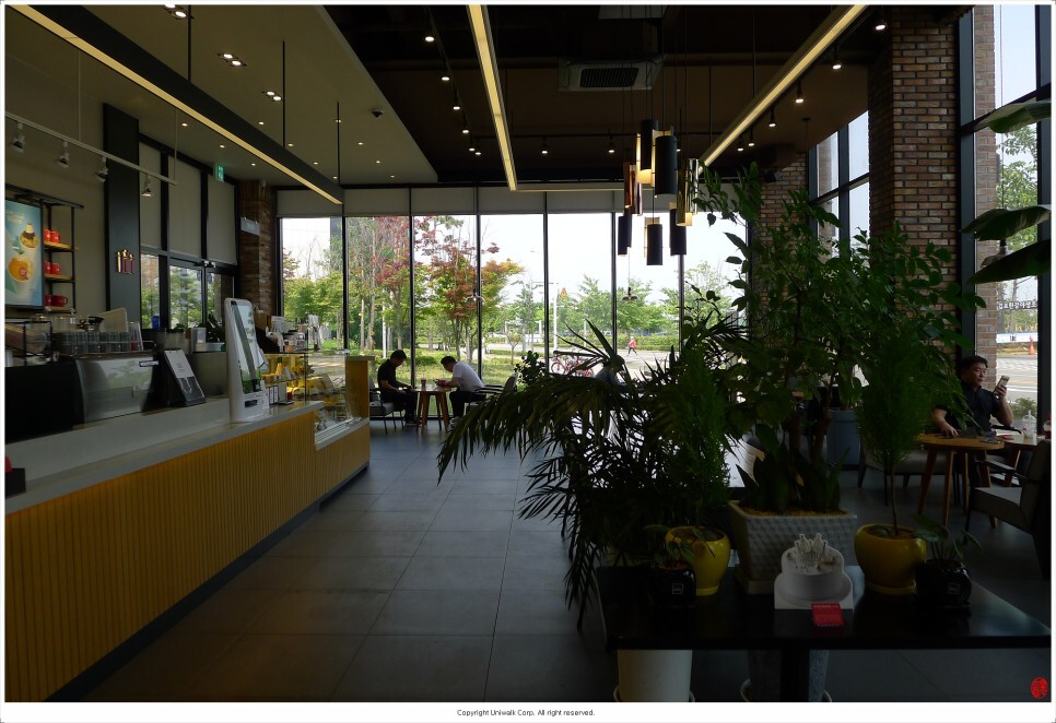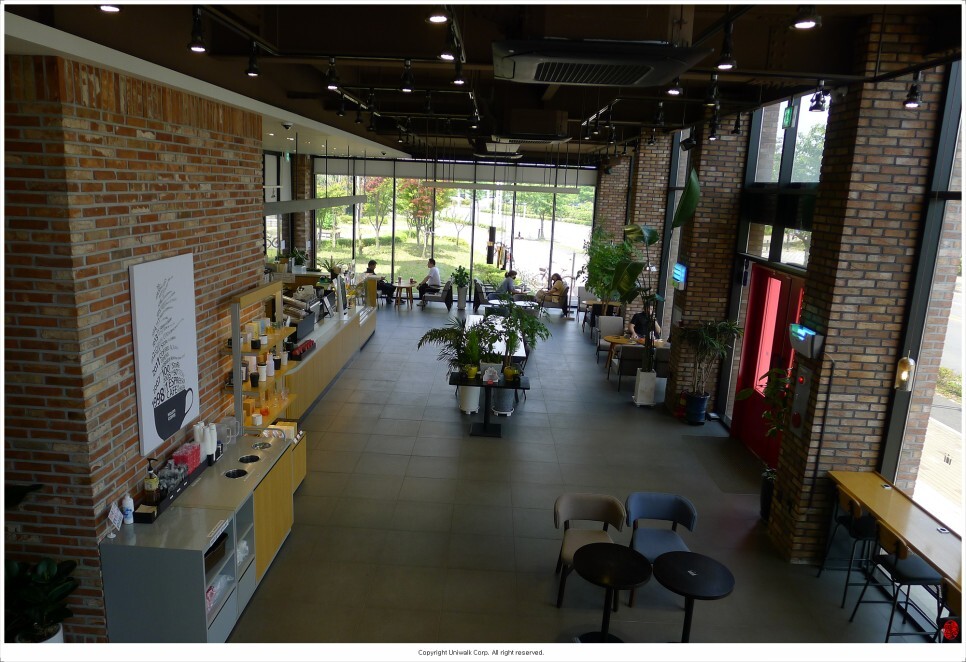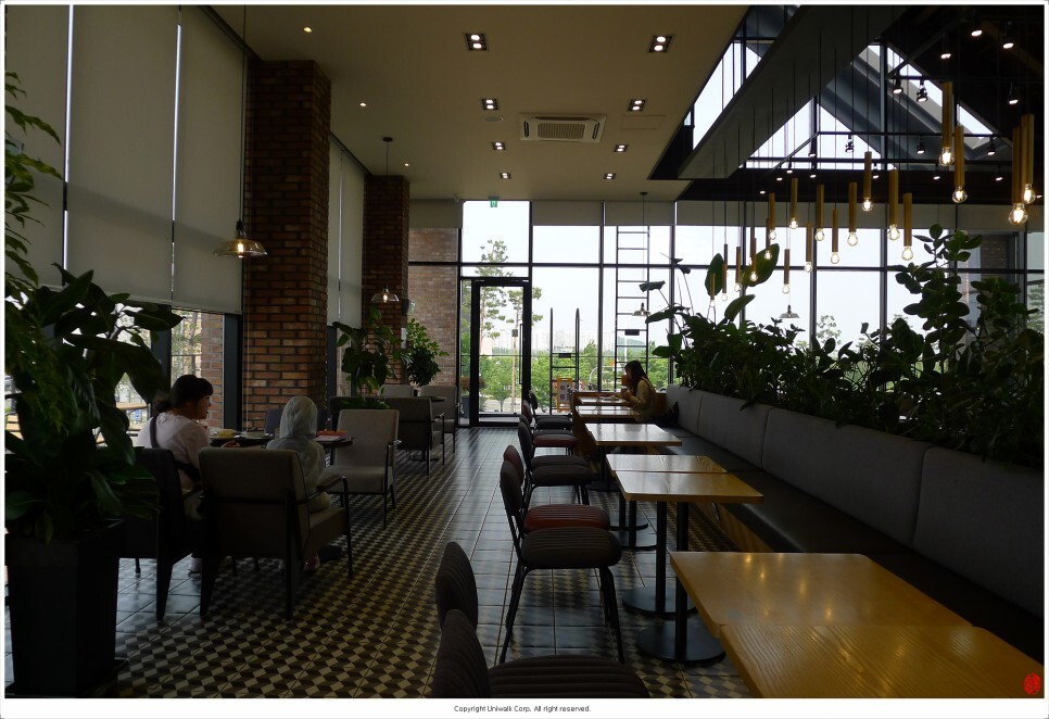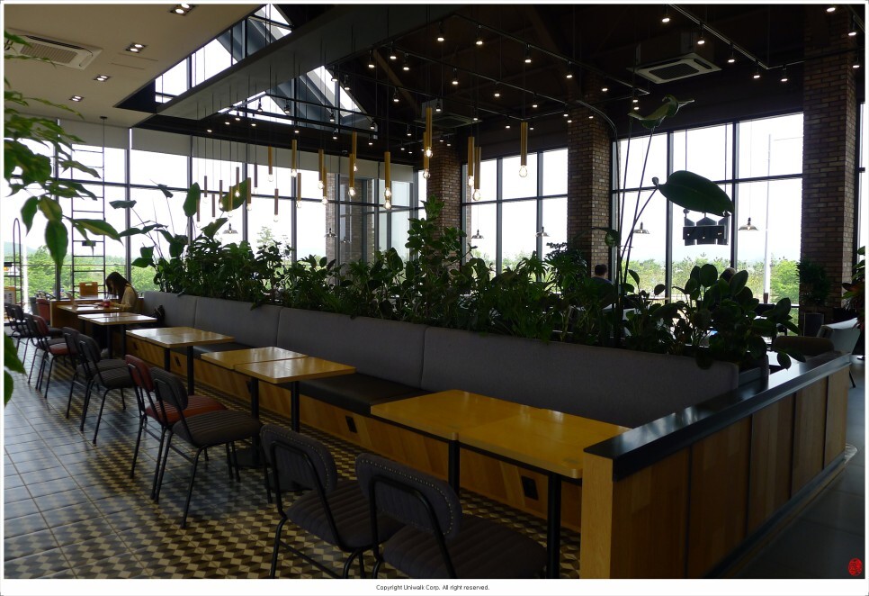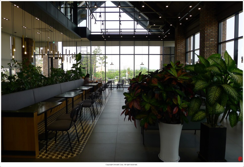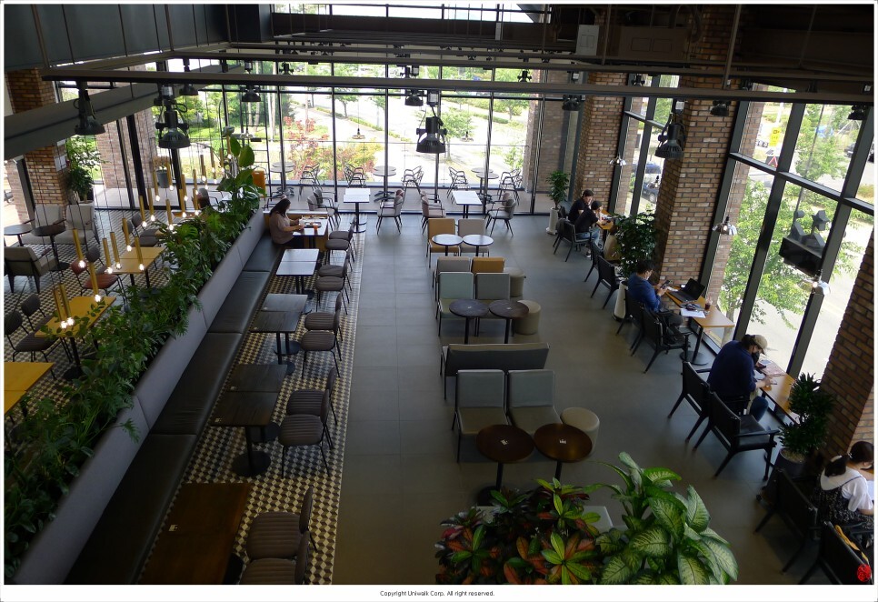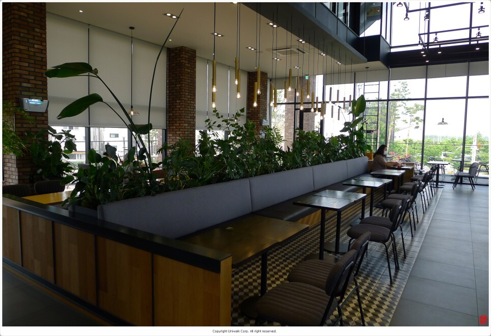2층은 중간쯤에 큰 테이블식 화분이 있고 곳곳에 열대 식물 화분을 놓아서 전체적으로 정원 같은 분위기를 내는 것 같고 2층의 층고가 높고 외벽은 거의가 통유리로 되어 있어서 외부의 전경을 바라볼 수 있게 되어 있어서 전체적으로 탁 트인 개방감을 느끼게 해주는 인테리어가 좋은 것 같습니다.