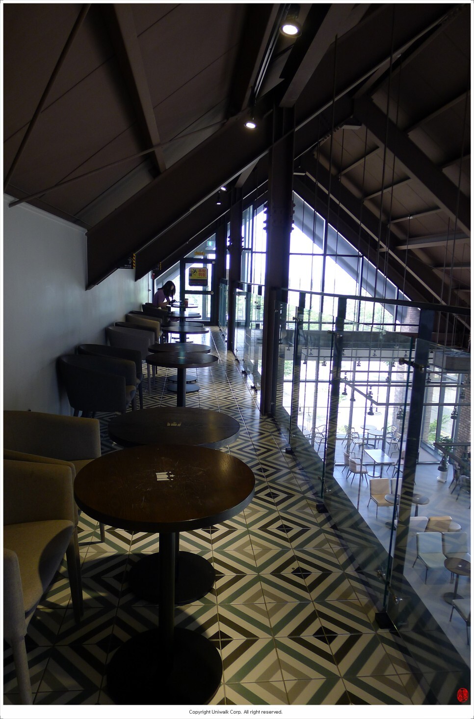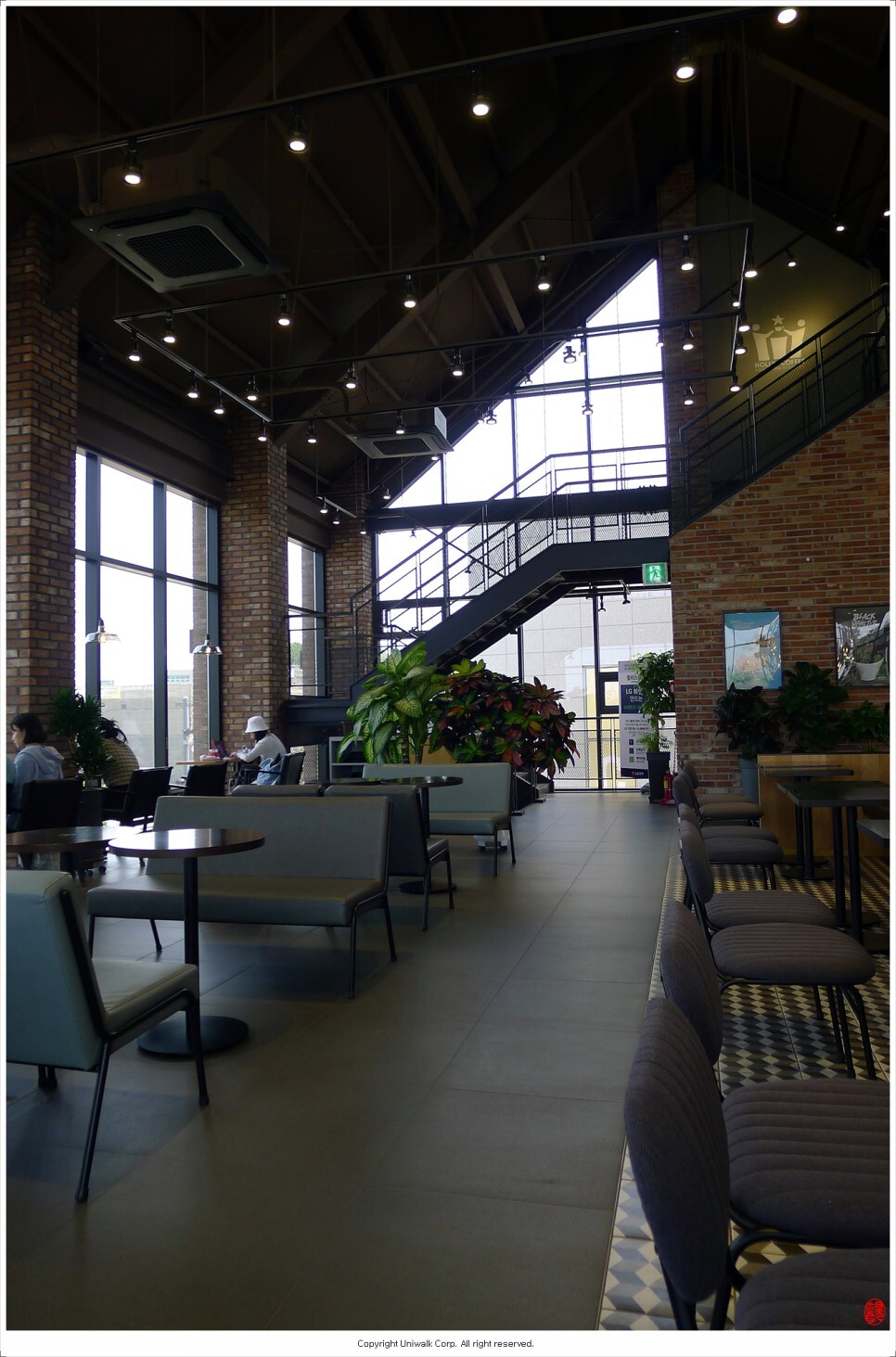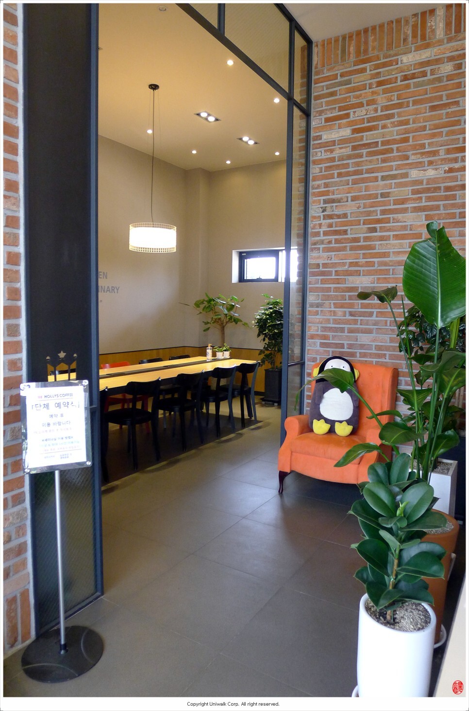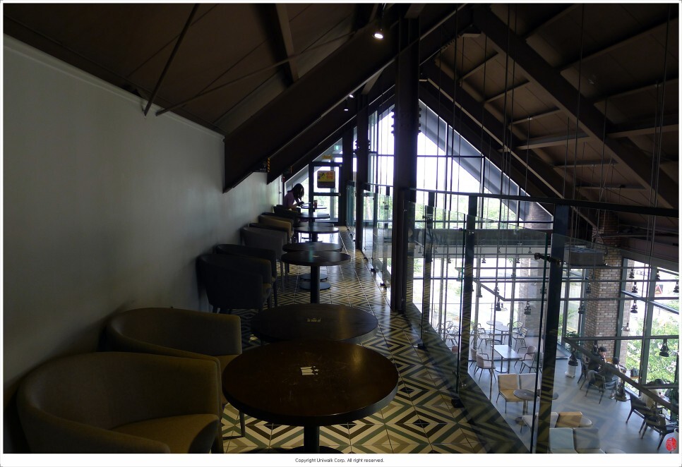 2층은 중간쯤에 큰 테이블식 화분이 있고 곳곳에 열대 식물 화분을 놓아서 전체적으로 정원 같은 분위기를 내는 것 같고 2층의 층고가 높고 외벽은 거의가 통유리로 되어 있어서 외부의 전경을 바라볼 수 있게 되어 있어서 전체적으로 탁 트인 개방감을 느끼게 해주는 인테리어가 좋은 것 같습니다.