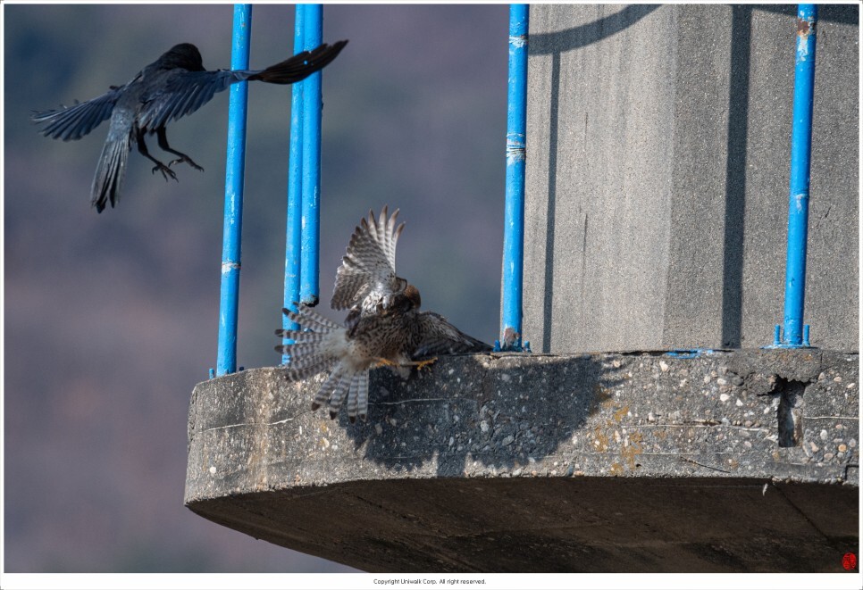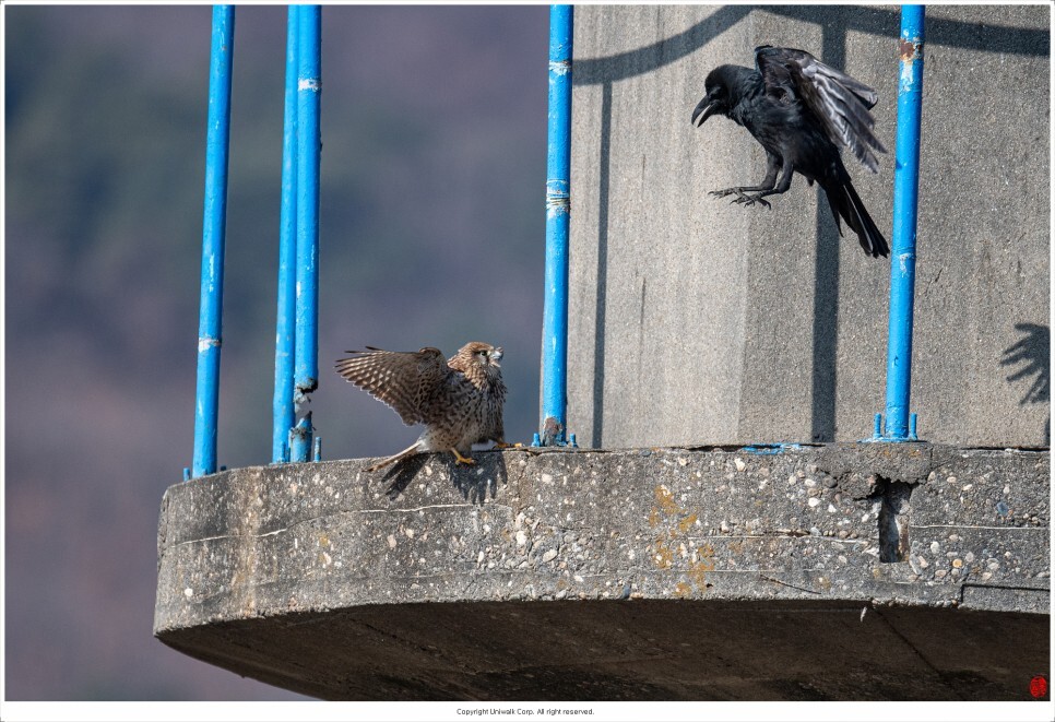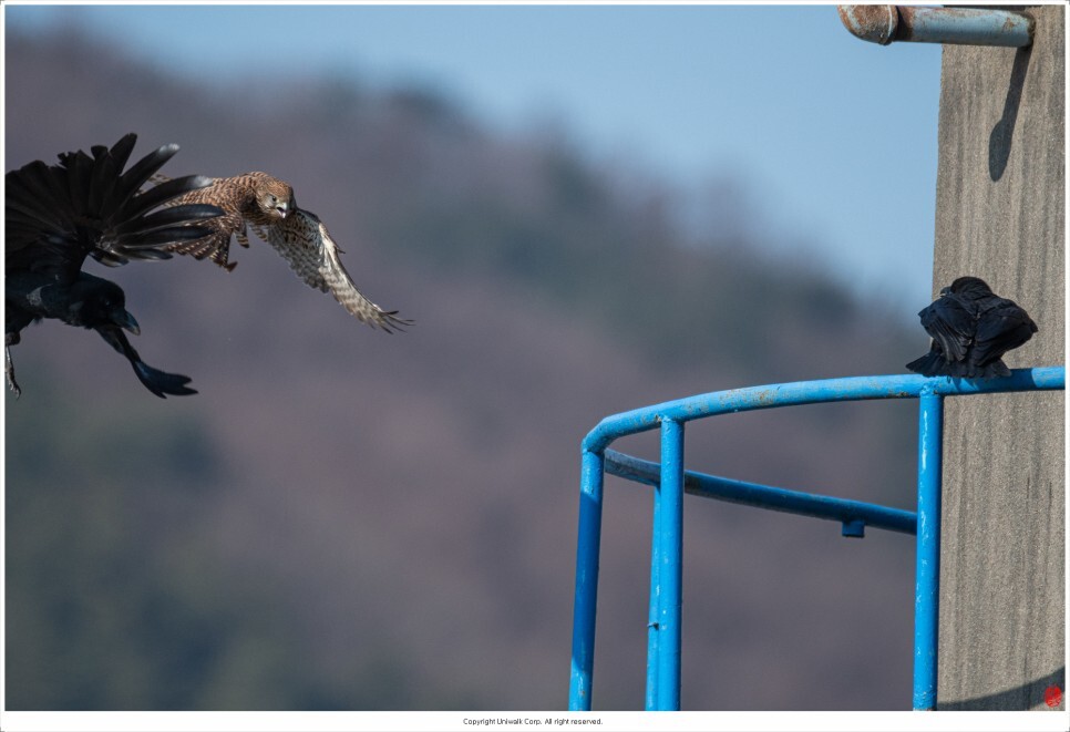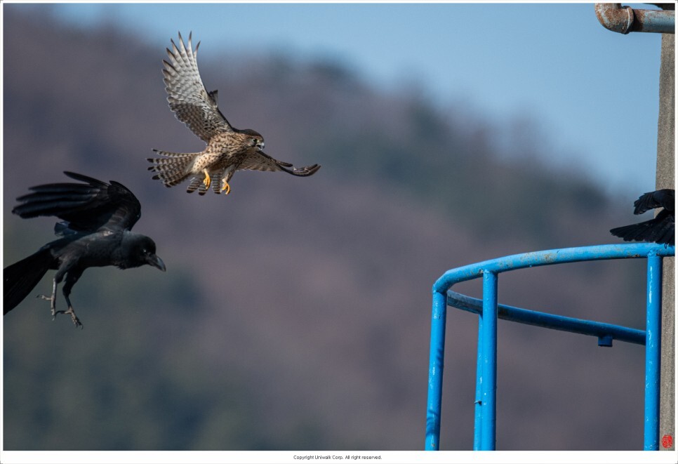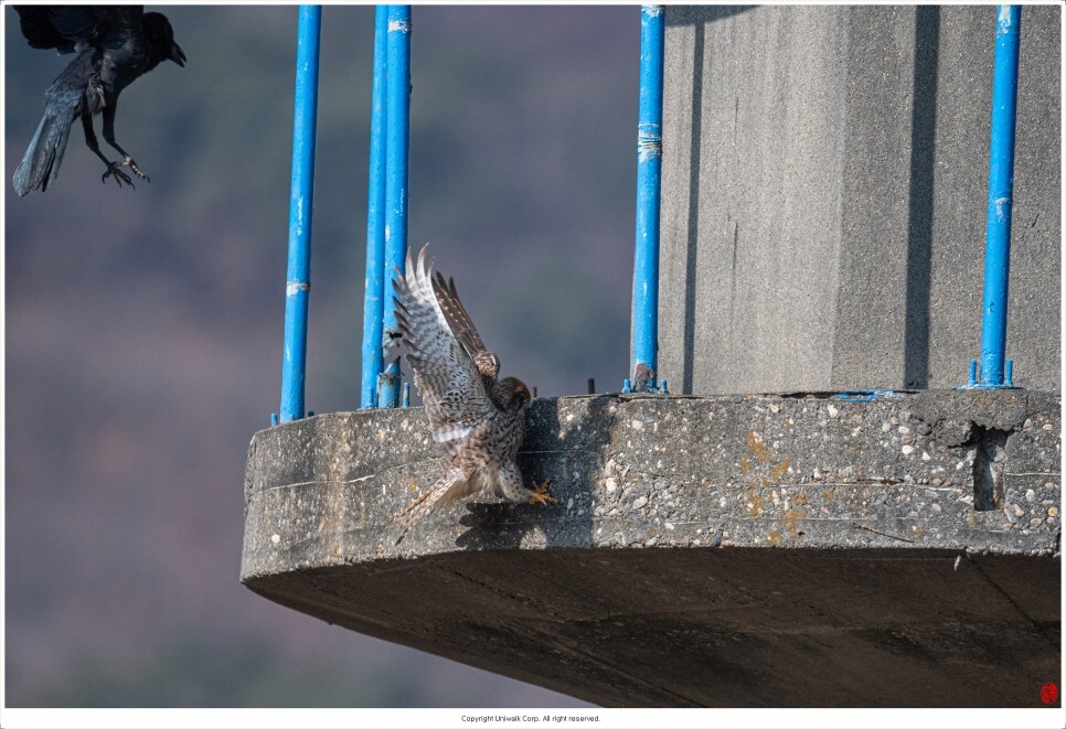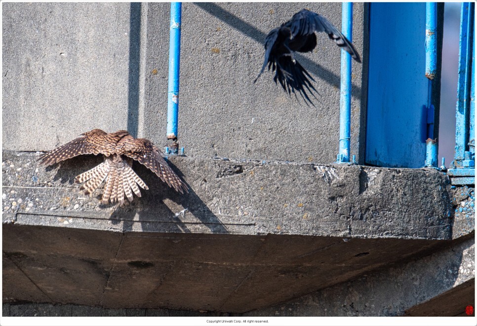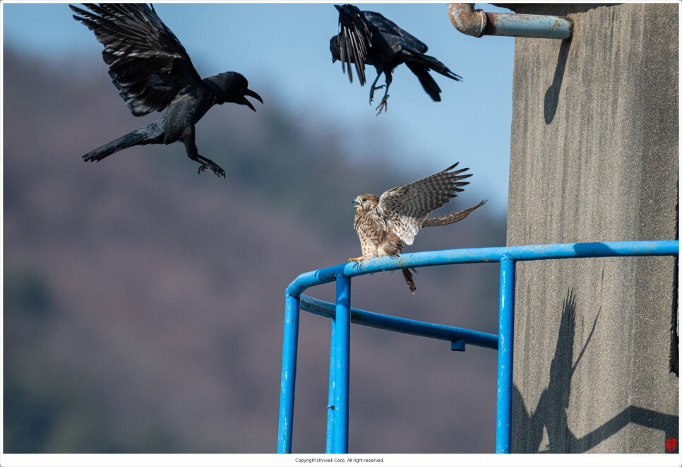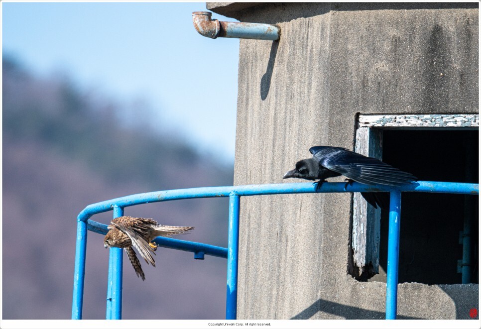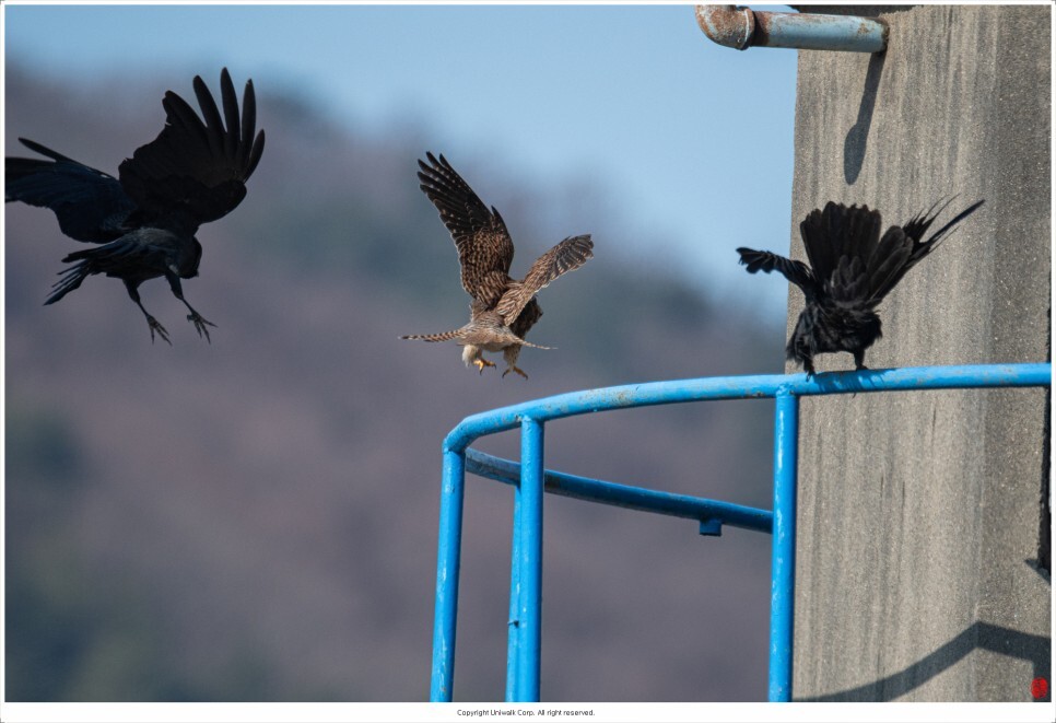 아래의 사진은 황조롱이가 먹이사냥을 위해서 수의탑에 앉아 있는데 까마귀들이 다가와 시비를 걸어 서로 다툼을 하는 장면으로 이날은 이 희귀한 사진을 담은 것 만으로도 큰 행운이 아닌가합니다.